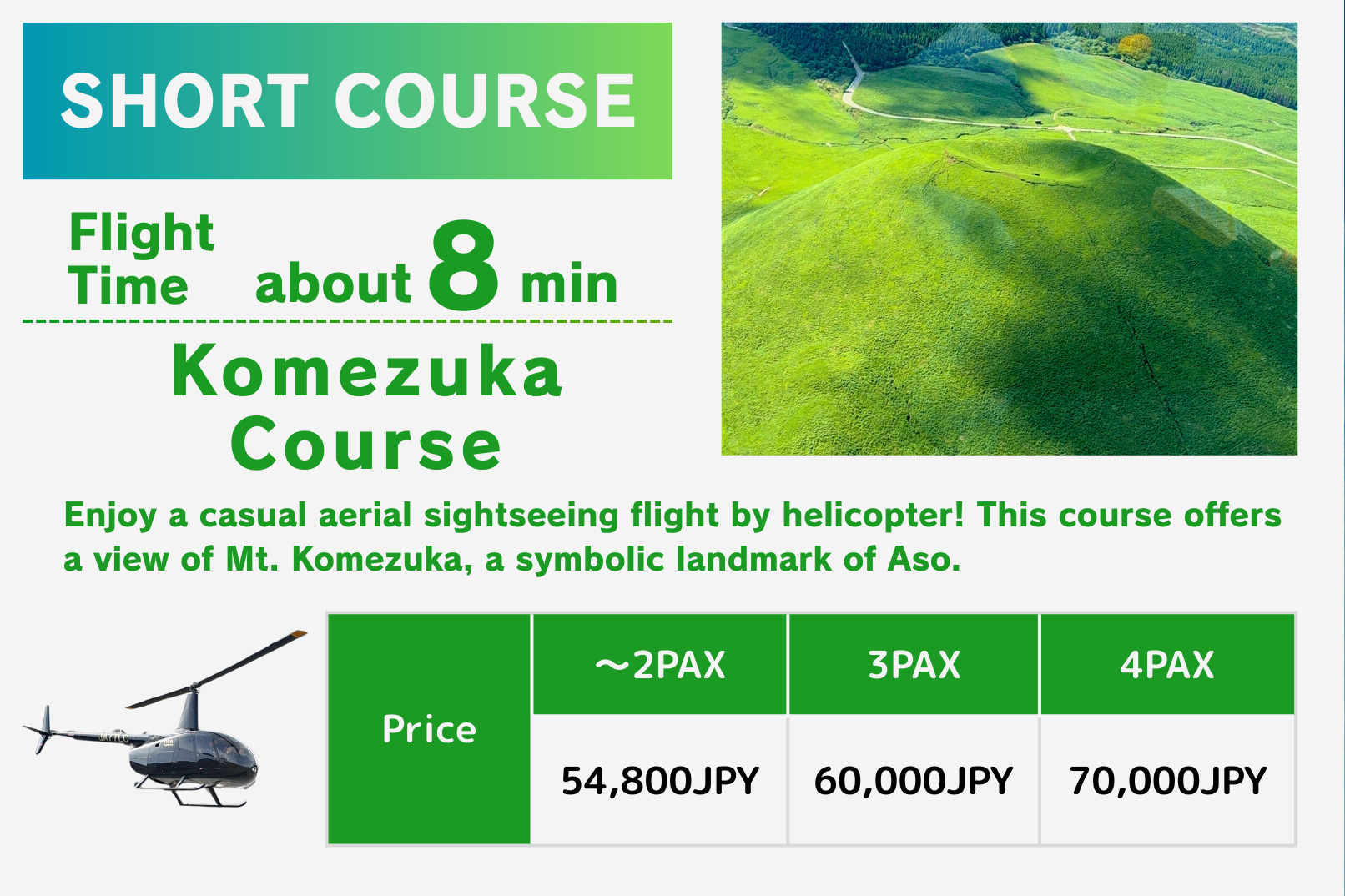 体验米塚・草千里的魅力(11分钟)本路线可欣赏草千里和米塚的美丽景色。 全程约 11 分钟,非常适合想放松、慢慢欣赏风景的旅客。 即使乘坐人数为 1~2 人,付款金额仍按照 4 人收费。 此方案为直升机完全包机,不与其他乘客拼机。